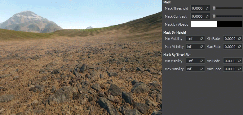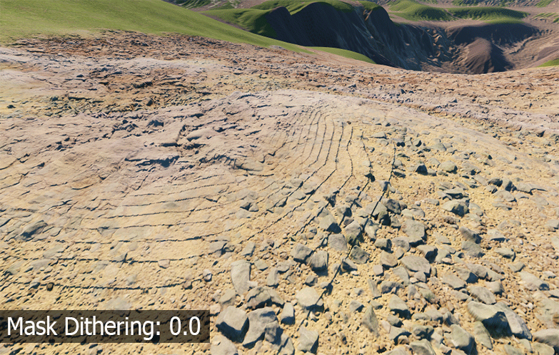 Ahora puede controlar el tramado de máscaras de detalle del terreno de paisaje para eliminar artefactos en degradados suaves de máscaras de detalle debido a la mordedura de máscara insuficiente. Este parámetro añade algo de fluctuación a las máscaras que puede resultar en algún ruido adicional, pero el aspecto final se pone mucho mejor.