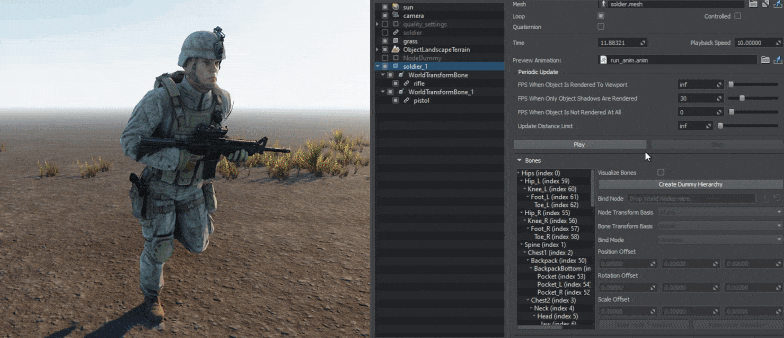 Mejoras en la animación con Unigine, ahora está disponible un control más avanzado y conveniente para las animaciones de malla y piel. Cada hueso de una malla de piel ahora se puede enlazar a un nodo independiente para controlar su transformación, lo que le da mucha flexibilidad.