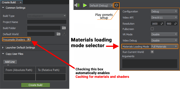 Almacenamiento en caché de materiales y sombreadores: este modo garantiza un trabajo estable y una reducción significativa de los picos, pero requiere mucha memoria y aumenta el tiempo de carga al inicio. Recomendado para la fase de producción cuando se entrega la aplicación al usuario final.