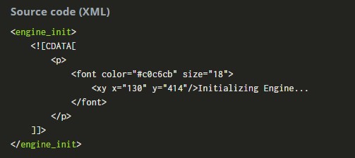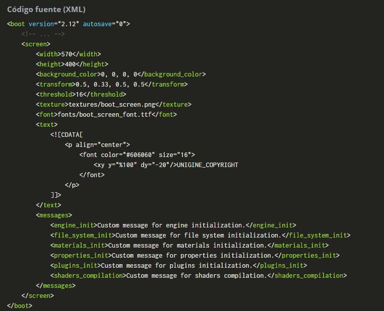 La pantalla de arranque es la primera vez que se inicializa el motor. Pasa por varios pasos de inicialización, mostrando el progreso de carga. Esta te ofrece mucha flexibilidad en la personalización mediante la edición de la sección de pantalla del archivo de configuración default.boot: