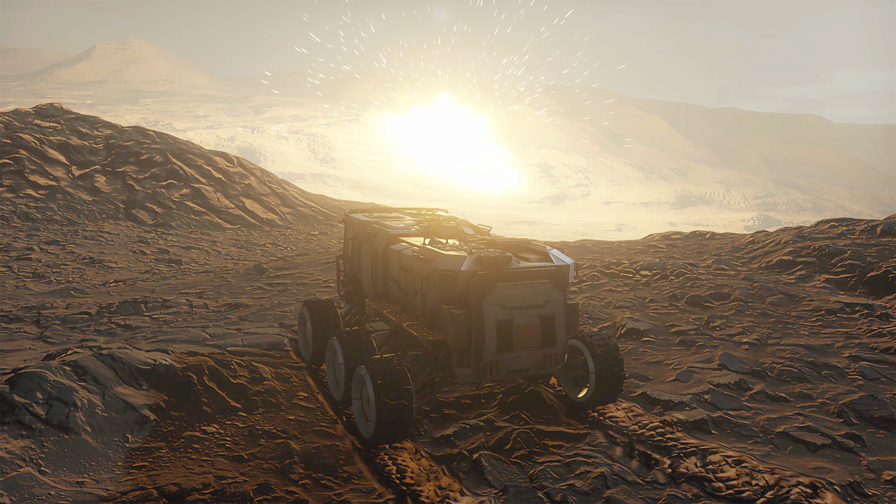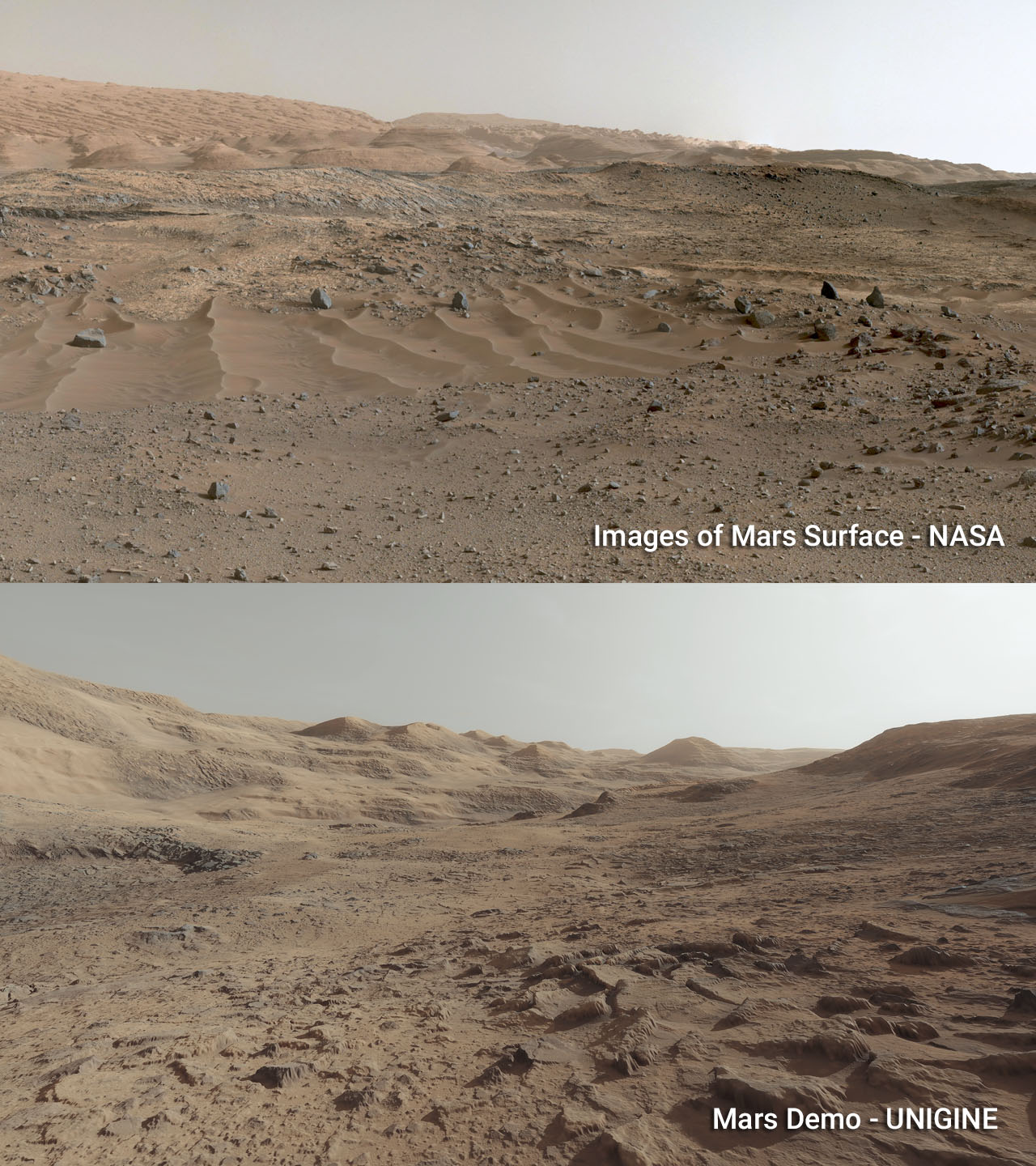 Mejoras en las nubes y la atmósfera. La atmósfera en el mundo virtual de Unigine ahora se ve aún más realista, con mejoras en el sistema de nubes y neblina físicamente correcta, por ejemplo, ahora es posible imitar la curvatura de la atmósfera del planeta, con la capacidad de establecer un radio específico para el planeta eliminando la brecha antinatural entre las nubes y el suelo en el horizonte.