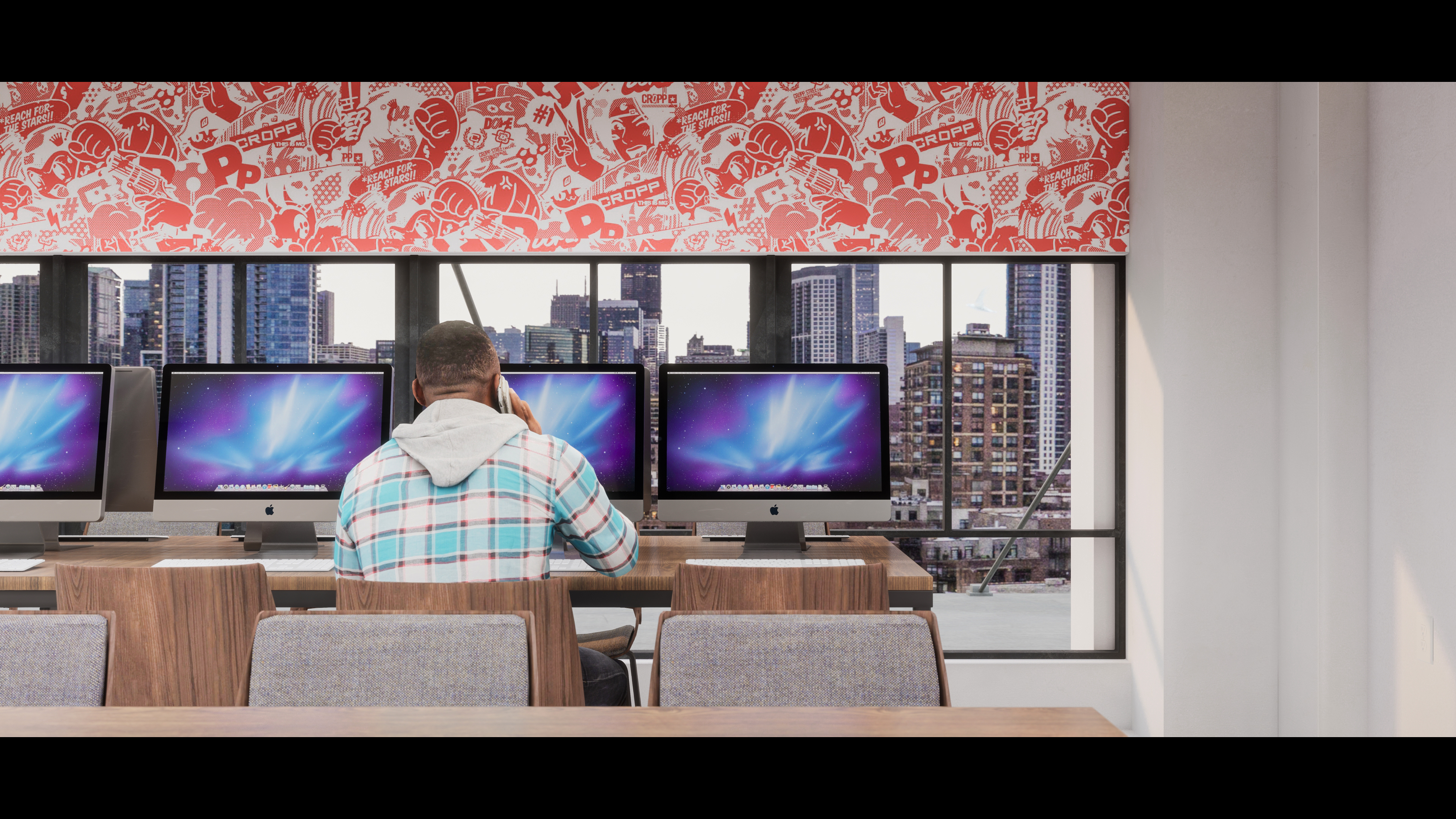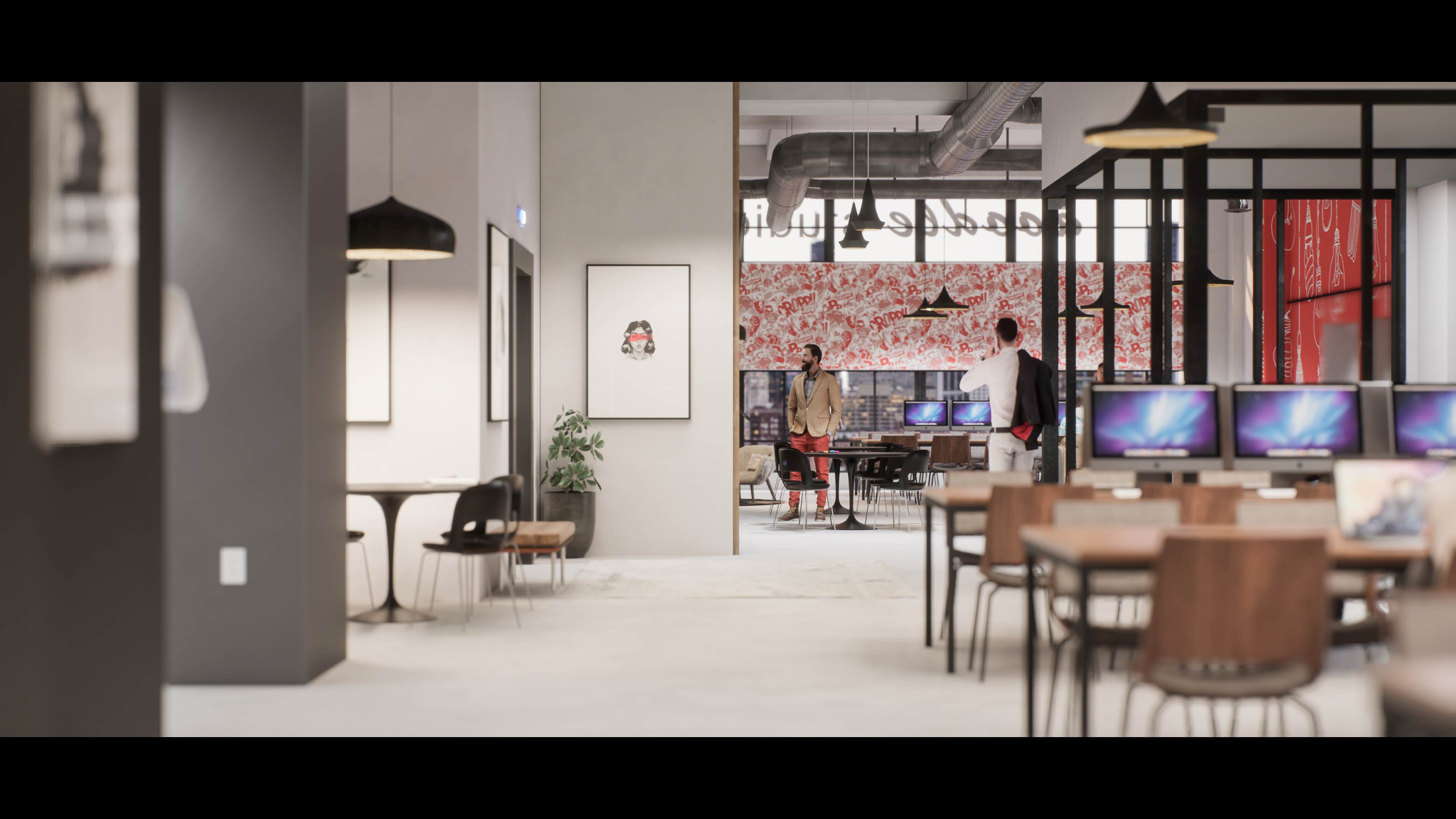 Es una oficina de estas de espacio conjunto, donde freelancers rentan un espacio para trabajar. Las imágenes están sacadas directamente de Unreal Engine.