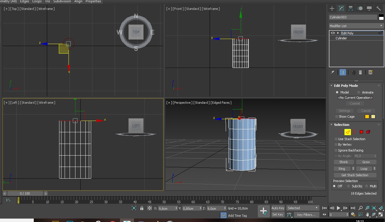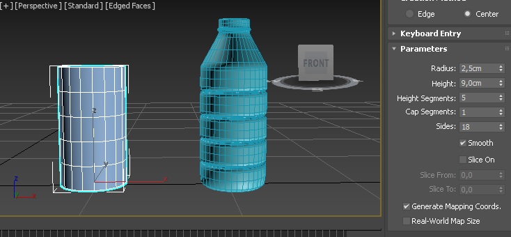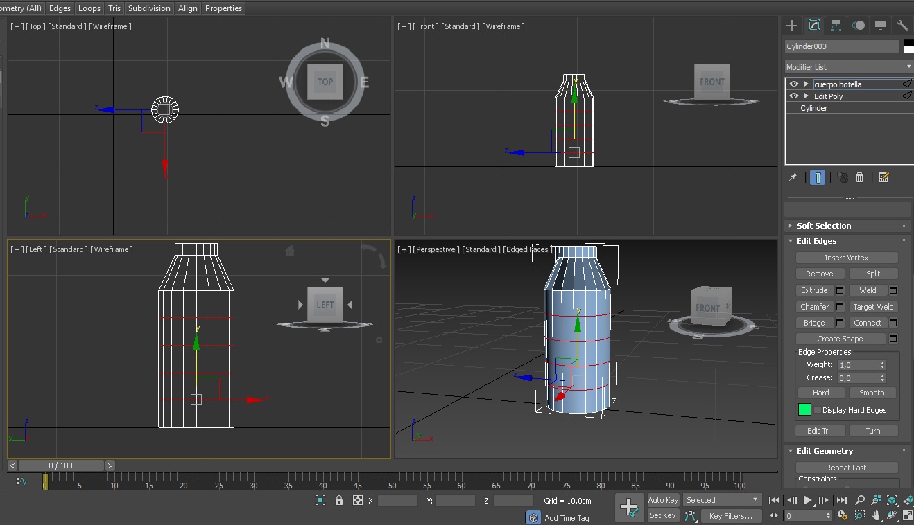1. Genero el cilindro y activo la vista de malla F4. La botella de la derecha es como me gustaría que quedase, una tipica botella de agua o zumo.