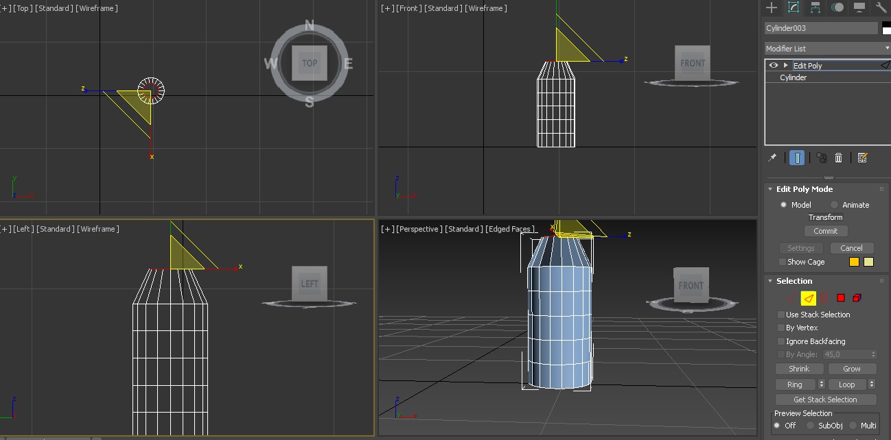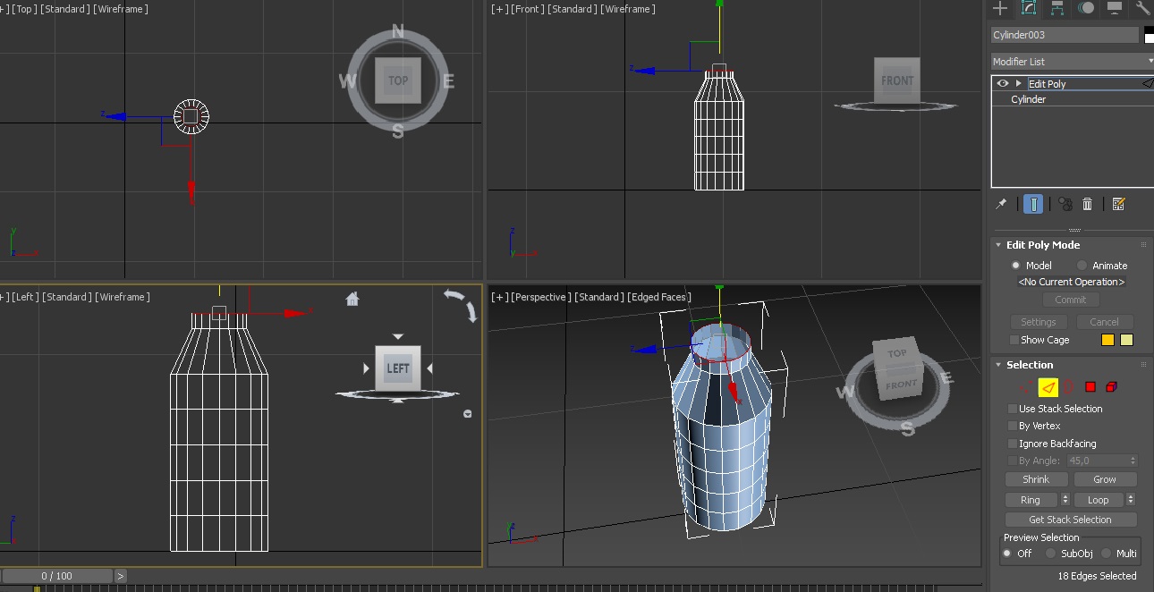 5. Hago otro edir poly y selecciono las partes del cuerpo de la botella para usar un chamfer.