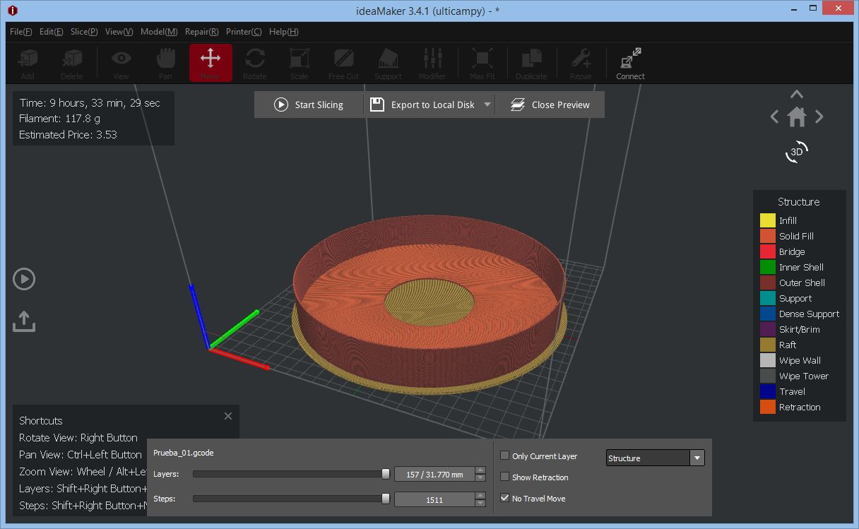Respecto a lo del modelo, no creo que sea el problema ya que el mismo modelo en Slic3r y Cura no tienen problemas, por lo que creo que el problema es de configuración de Ideamaker, abajo mismo modelo en Cura: