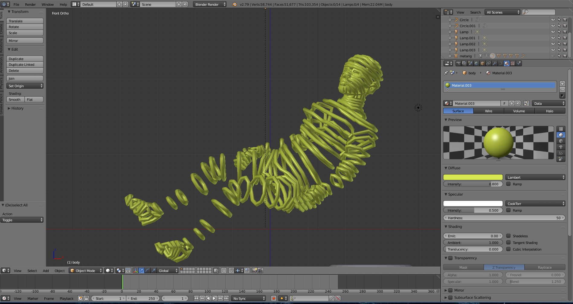 Tal como lo tienes en Blender, en la imagen de la derecha, o sea, el personaje de las vendas, le pones un simple plano debajo del cuerpo con la forma de la tumbona, y al plano le pones la opción de Shadow Catcher.