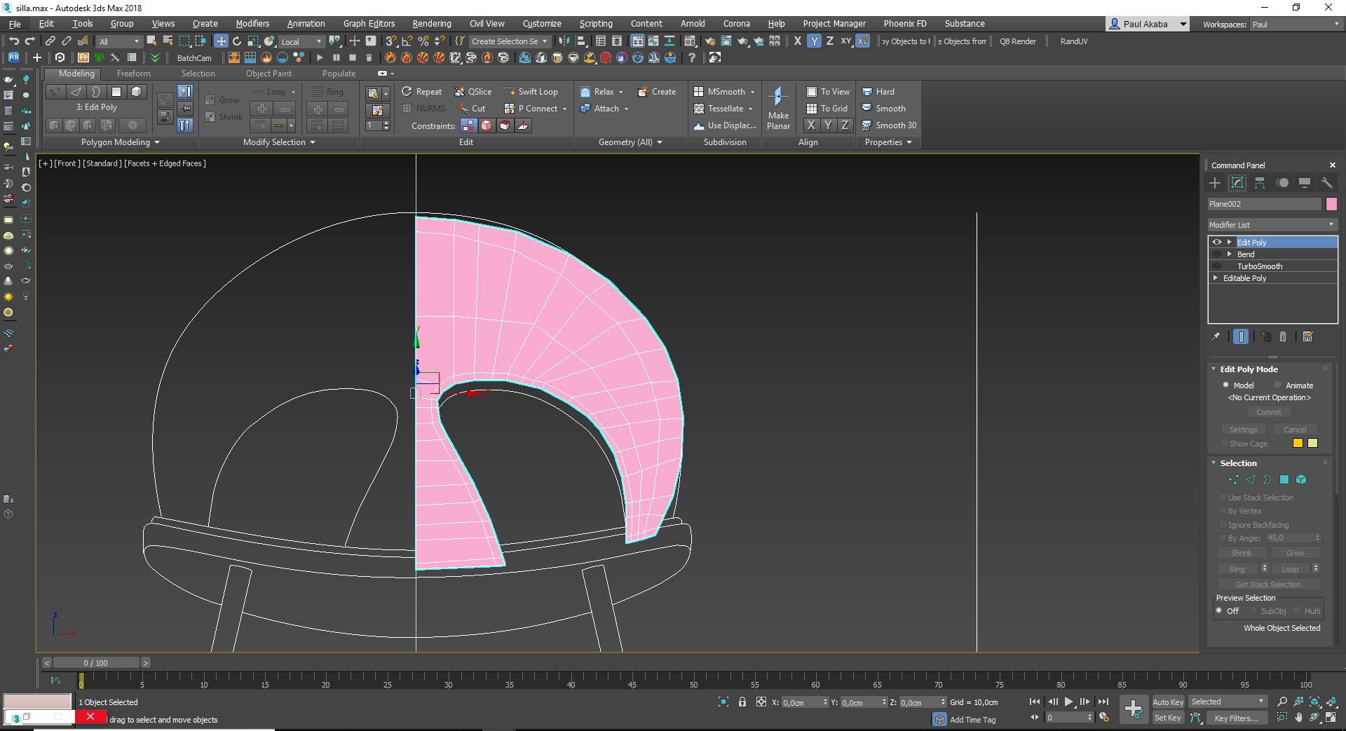 El respaldo tiene una curvatura desde su eje central y además está inclinado. He intentado con un bend cuadrar esa curvatura con los planos, usando FFD box pero no hay manera. Seguro que se me está escapando algo.