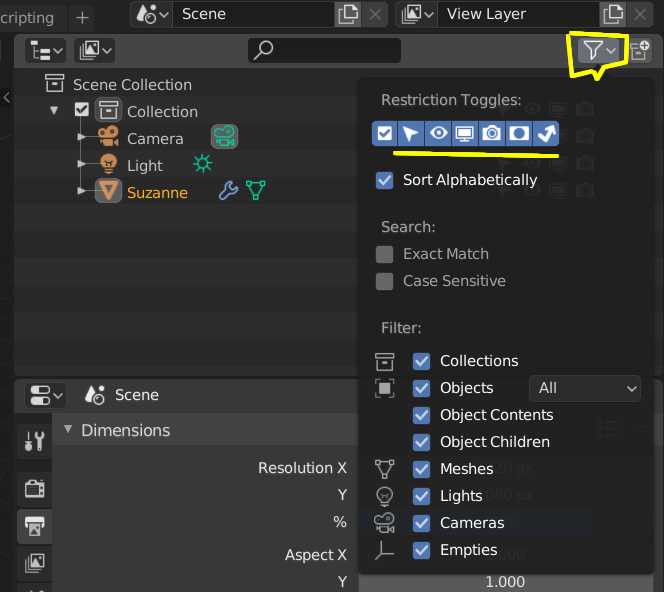 Buenas, soy nuevo en Blender y estoy intentando aprender a modelar personajes, mi problema es que en el menú de los objetos que tengo en escena, puedo ocultarlos visualmente, pero no me deja la opción del candado para no modificarlos. Adjunto fotografía. ¿Alguien sabe qué tengo que hacer para que aparezca? No he tocado ninguna opción.