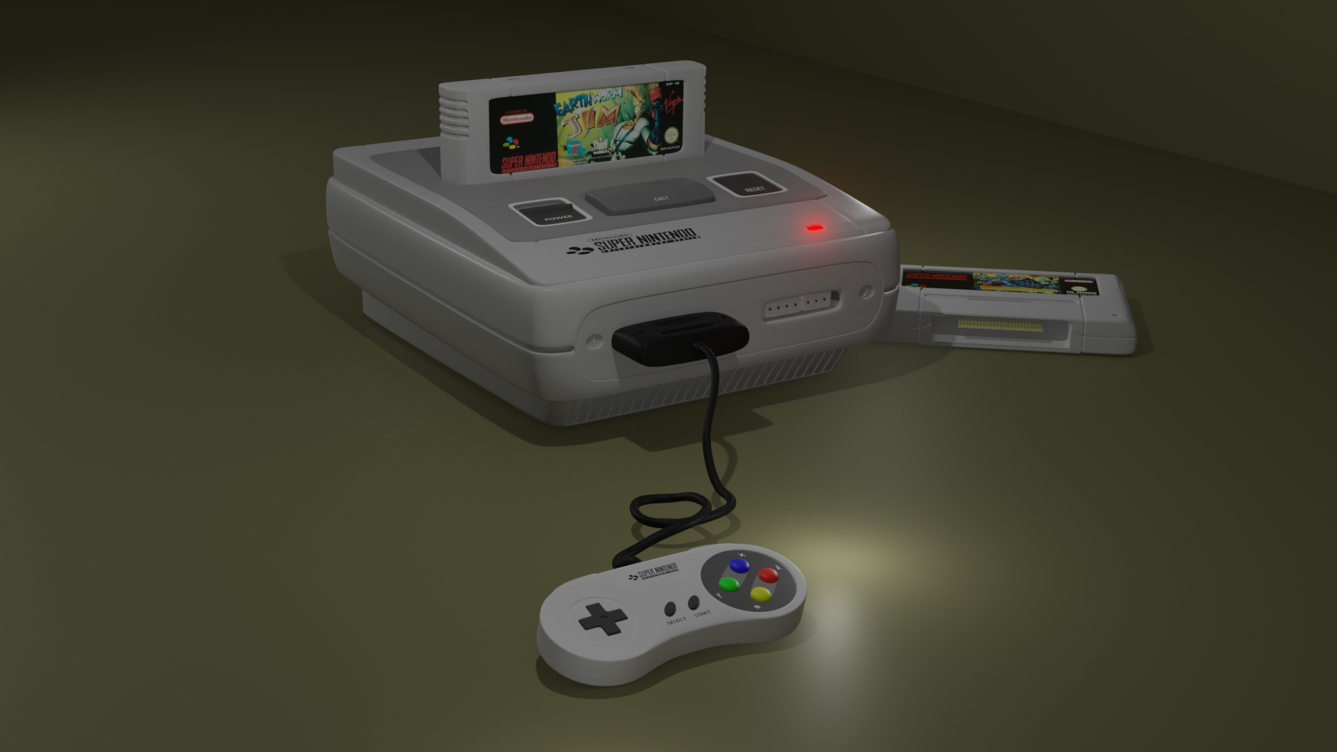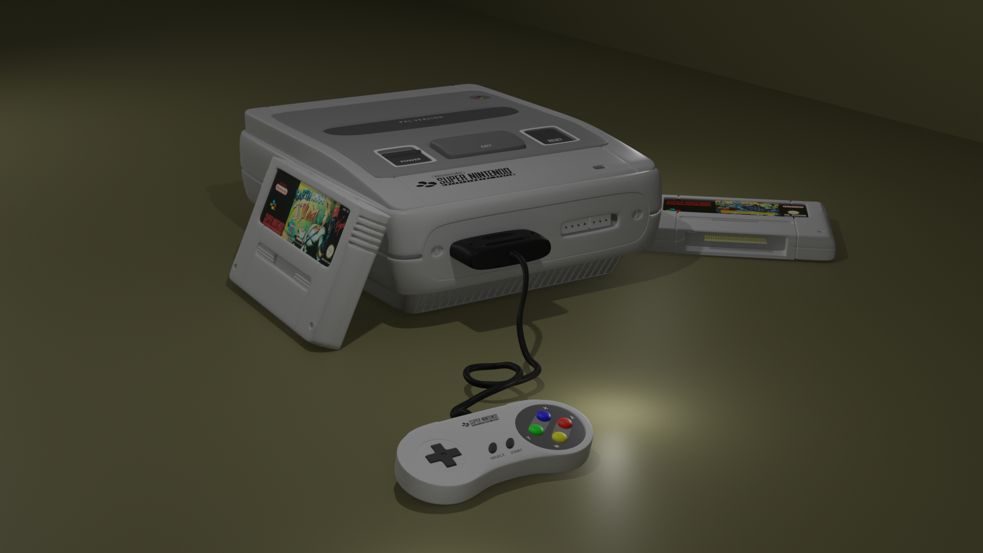 Modelo de una consola Super Nintendo con Blender 2.8. Está compuesto por 1,522,915 caras en total.
