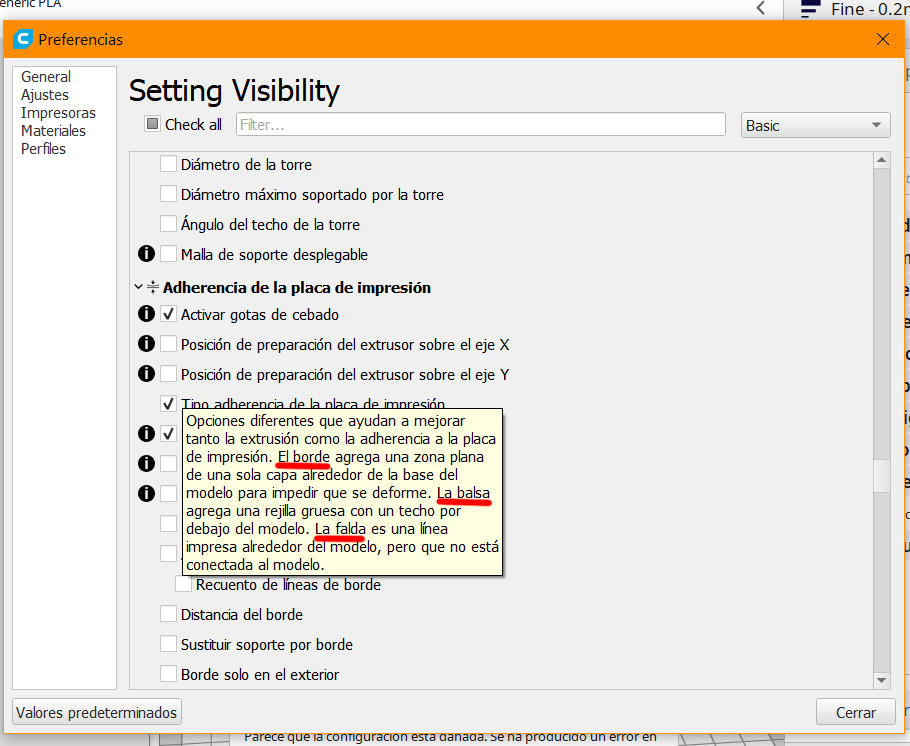 De todas formas mira en el Slicer si tienes la opción de FALDA, BALSA, BORDE, o NINGUNO (en CURA está en Adherencia de la placa de impresión).