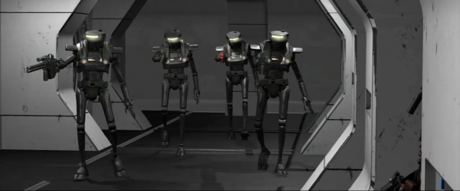 En la escena donde hay una pelea desigual de 9 contra 1, exactamente esto sucede en el capítulo 9 de la primera temporada, en la que Mando se defiende de múltiples droides a la vez, Third Floor creó los activos previos con captura de movimiento para visualizar la coreografía de personajes en tiempo real, trabajando con el director Rick Famuyiwa y el equipo de acrobacias estableciendo un intérprete de captura de movimiento para mover a Mando y tres artistas de acrobacias adicionales para representar a los robots. Capturando el movimiento en múltiples pasadas, con Mando repitiendo su movimiento y los otros actores interpretando diferentes robots para cada pase.
