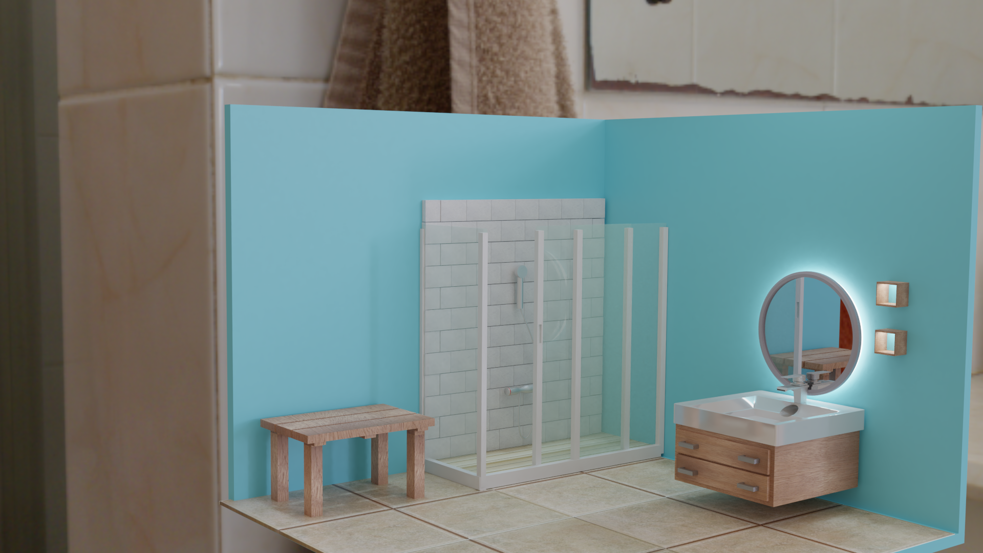 La escena tiene 3 luces, y varios materiales imitando espejo y translucidos mampara de baño.