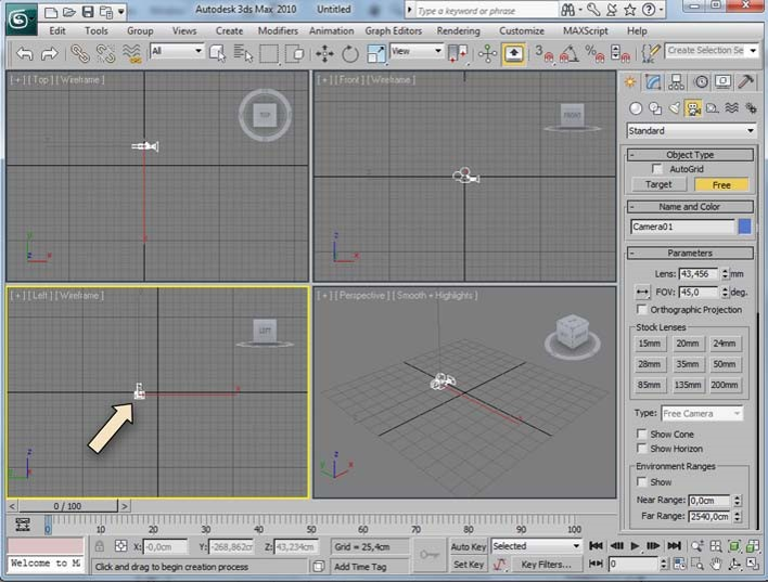 1) Creamos una cámara libre que enfoque a una de las paredes con una lente de aproximadamente un gran angular, alrededor de los 20mm. Esto nos permitirá optimizar el espacio de visualización del espectador.