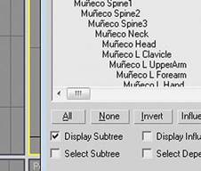 Esto nos abrirá un cuadro de diálogo emergente con todos los elementos que contiene ahora nuestra escena. Si en este cuadro emergente activamos la casilla Display Subtree, podremos ver cómo están organizadas las dependencias de todos los elementos del esqueleto al tiempo que también podremos seleccionar aquel que nos interese.