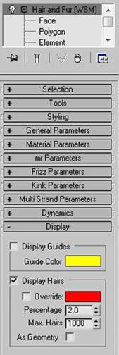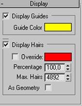 Desde el panel Display de este modificador, podemos controlar la cantidad de pelos que van a verse durante el proceso de trabajo. Para visualizarlos todos, es necesario renderizar la escena. Es importante tener presente que, cuantos más pelos queramos ver en las ventanas del proyecto, más cantidad de memoria vamos a consumir de nuestro ordenador, con lo cual los tiempos de trabajo pueden alargarse considerablemente e incluso, dependiendo del ordenador, podemos llegar a saturar la memoria, no pudiendo completar así nuestros propósitos.