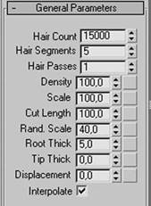Desde el panel de parámetros generales (General Parameters), pueden conocerse el número total de pelos que se mostrarán en el render final, el grosor de los mismos, la densidad de la masa capilar o la cantidad de segmentos que tendrá cada pelo. La cantidad de segmentos serán los que permitirán que el pelo pueda tener un aspecto ondulado y/o rizado.