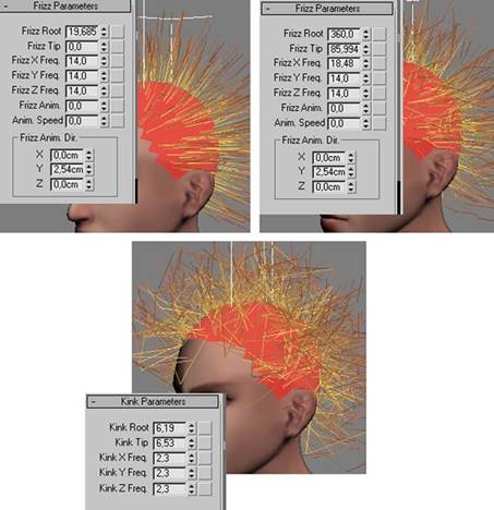 Los paneles FrizzParameters y KinkParameters permiten definir la cantidad de rizado (Frizz) y ondulado (Kink) que va a tener el pelo que estamos creando.