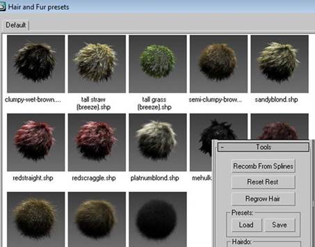 Otro aspecto importante de este panel es el hecho de permitir cargar aspectos predefinidos de pelo. Se trata de archivos con extensión shp y, aunque pueden crearse de forma personalizada mediante el botón Save, MAX dispone de algunos presets ya disponibles. En la web encontraréis multitud de ellos, muchos de los cuales admiten descargas completamente gratuitas.