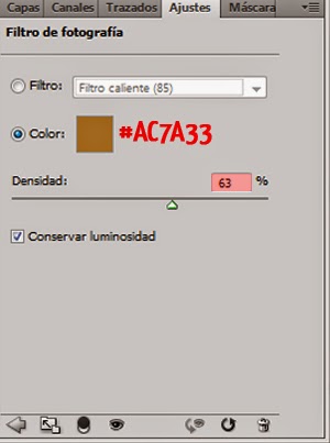 A continuación un Ajuste de Filtro de Fotografía utilizando el color #ac7a33 y una densidad del 63%.