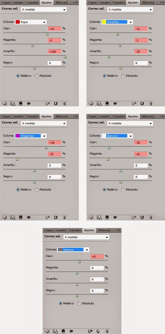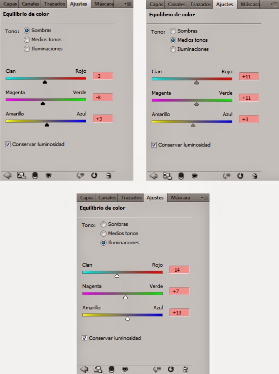 Crea un Ajuste de Equilibrio de color en la parte superior con los siguientes valores y a continuación enmascara las siguientes zonas.