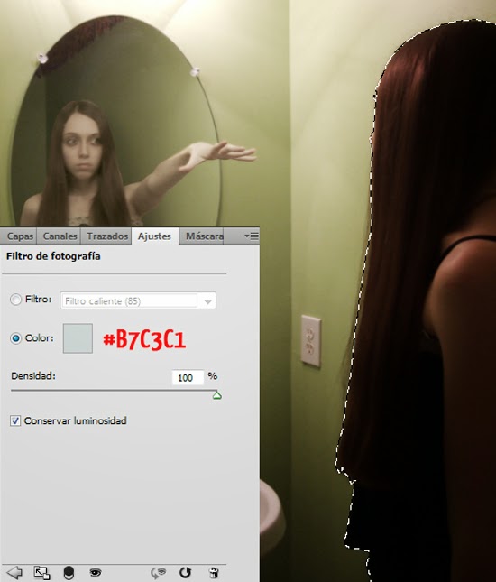 Ahora, ya que quizás la modelo de la derecha se ve un poco saturada en comparación con la modelo del espejo, selecciona el cuerpo de la modelo y aplícale un Ajuste de Filtro de Fotografía al 100% con el color #b7c3c1.