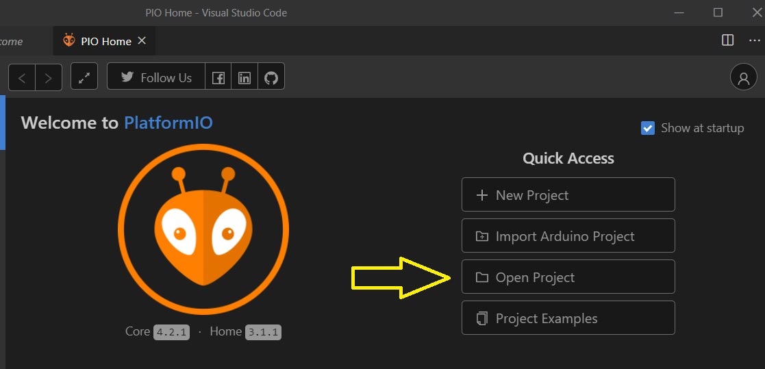 Si pulsamos en esta pestaña, PlatformIO nos dará la bienvenida y nos mostrará varios botones de acceso rápido (Quick Access).