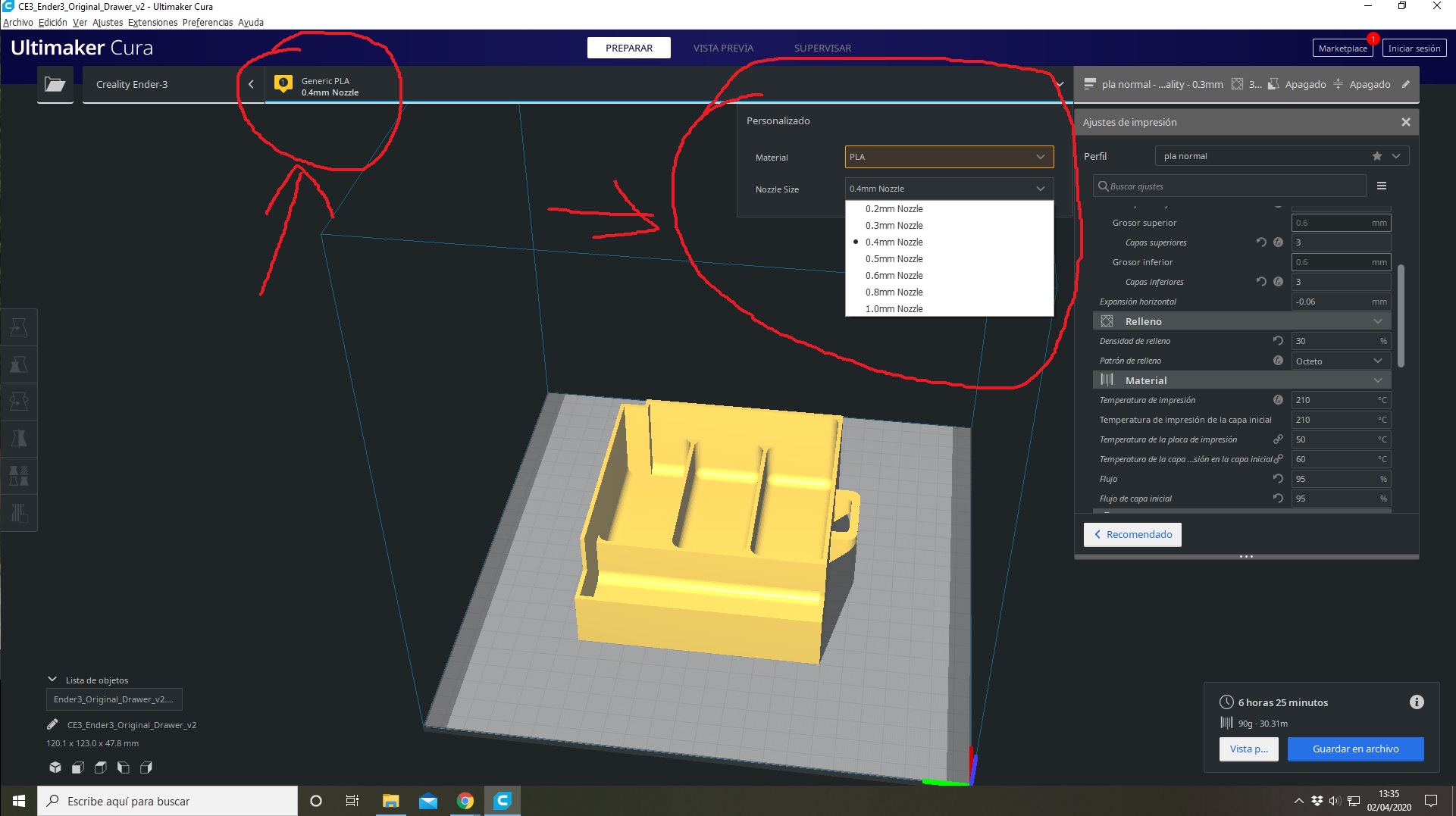Tanto las paredes de fuera como el relleno lo genera sin problema alguno en 1 milímetros de extrusor, pero cuando pongo 0,4 ni agarra a la cama. He estado en contacto ya con 6 personas que ninguna ha sabido darme una solucion.