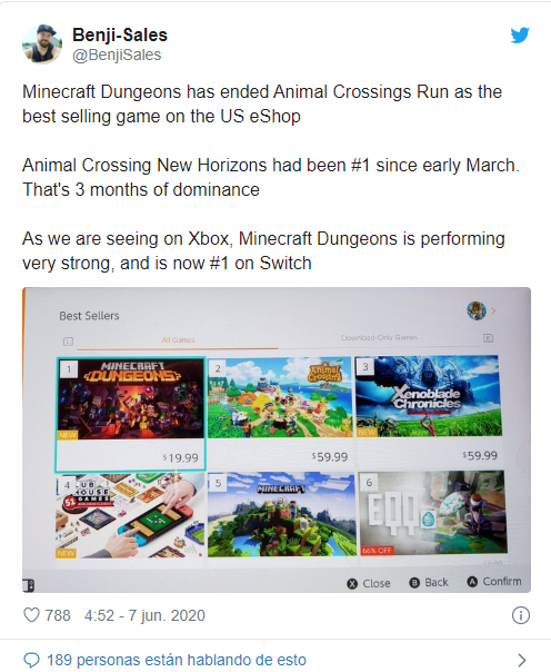 El día 26 de Mayo, Minecraft Dungeons salió a la venta, ya había mucho revuelo tiempo atrás de su lanzamiento y actualmente ha vencido a Animal Crossing en número de ventas de Nintendo Switch en EEUU. Con Animal Crossing también tenían una fanbase, pero con las más de 200 millones de copias vendidas que acumula Minecraft en todo el mundo, la saga de Microsoft contaba con una buena base de usuarios de cara al lanzamiento de Minecraft Dungeons.