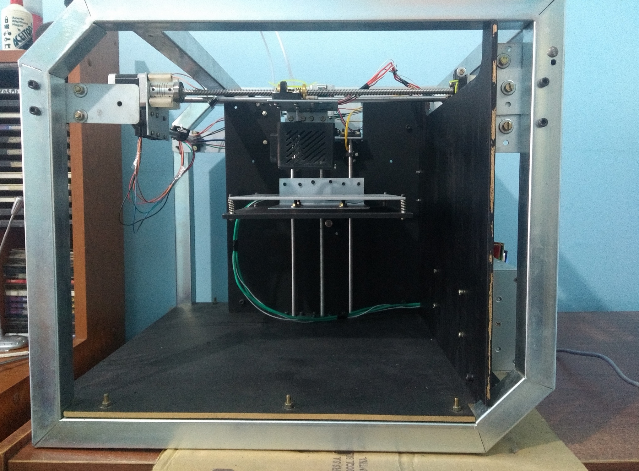 Buenas. Por un proyecto personal estoy diseñando mi propia impresora 3d. Con una estructura propia pero los componentes (motores, electrónica, mesa, hotend) son los mismos que una Prusa podría decir. Aqui pongo una fotografía de la máquina en cuestión.