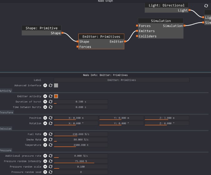 Los emisores requieren una entrada de forma dentro del gráfico de nodo para que funcione. Puedes colocar varios nodos emisores dentro del gráfico de nodos, y cualquier emisor puede tener varias formas. Si tuvieras un emisor que no emite temperatura ni combustión, y otro que solo emite temperatura el emisor que es solo temperatura encendería el combustible.