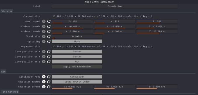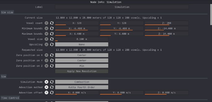 Puedes cambiar la resolución de tu simulación en la sección "tamaño de la simulación" en la parte superior de este nodo. Al cambiar valores en la sección "tamaño de sim", debes hacer clic en "aplicar nueva resolución" para aplicar los cambios. Cuidado con las grandes resoluciones.