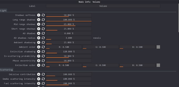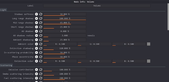 Con el nodo de volumen controlas cómo se procesa el volumen. Controlas la dispersión emisiva, la temperatura, la configuración del cuerpo negro, las densidades del fuego y el humo, los colores del fuego y del humo, y otros parámetros afines dentro de este nodo.