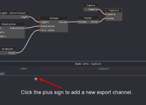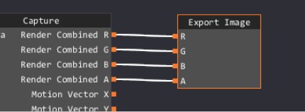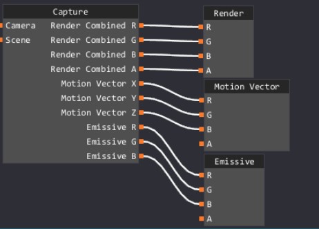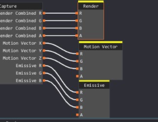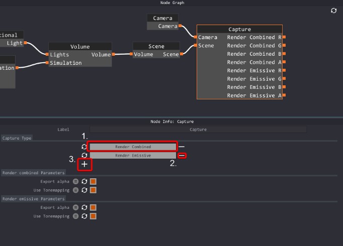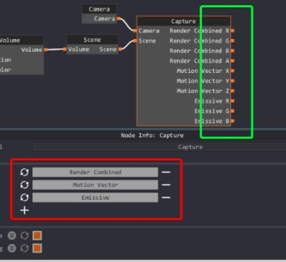 4.Después de asegurarte de que la vista previa se ve bien, haces clic en el nodo de captura para que podamos agregar un canal para la exportación. Depende de ti elegir qué datos desea exportar. En este caso queremos exportar nuestro Render Combined, Motion Vector y Emissive. Haces clic en el signo más 3 veces para agregar tres nuevos canales. Puedes seleccionar canales en los menús desplegables que aparecen. La caja roja muestra los tres nuevos menús desplegables con el correcto Selecciones. Los signos menos junto a estos nuevos menús desplegables eliminarán esa captura.