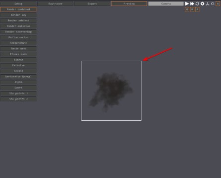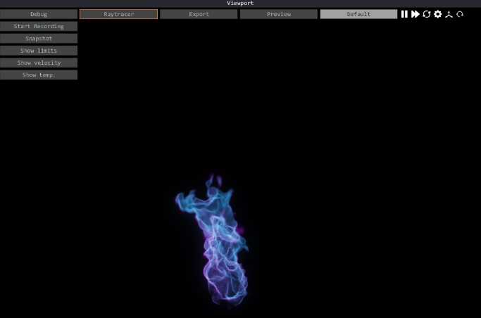 RayTrace: la ventana de RayTrace te mostrará toda la escena que se compone de una luz direccional, un suelo y un cielo opcionales y el volumen. El volumen y la simulación que ves dentro de esta ventana es el aspecto que tendrá tu render final. El cielo/suelo no se incluyen en los renders.
