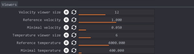 Mostrar velocidad: muestra una representación de la velocidad dentro de la simulación. La configuración de visualización se puede controlar haciendo clic en el icono de engranaje en la parte superior derecha con la configuración que se muestra a continuación.