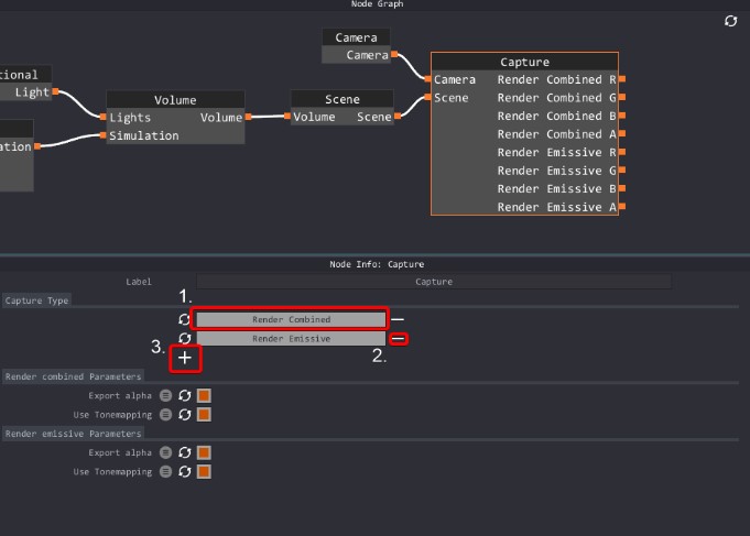 El nodo de captura te permite crear y exportar flipbooks y secuencias de imágenes de cualquier tipo de datos que desees exportar. Puede presionar el signo más ("3" en la imagen de abajo) para agregar un nuevo tipo de exportación al nodo. El signo menos ("2") eliminará ese tipo de exportación. ("1") es un selector desplegable que le permite seleccionar un tipo de exportación.
