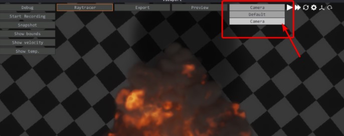 2.Una vez que estés satisfecho con la simulación, ve a la ventana de vista previa haciendo clic en vista previa en la ventanilla 3d. A continuación, debes seleccionar la cámara de renderización predeterminada, ve a la lista desplegable superior derecha en la ventanilla y haces clic en predeterminado y elijes "Cámara" del menú desplegable.