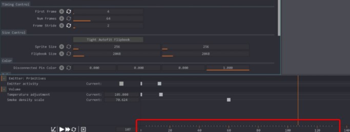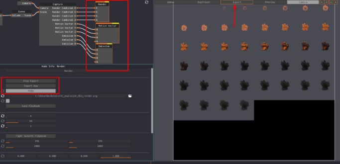Vista previa: la ventana de vista previa te mostrará cómo se alineará tu simulación dentro de tu Flipbook y esencialmente te mostrará los límites de los marcos de tu Flipbook. También puedes obtener una vista previa de todas las exportaciones de datos y ajustar sus parámetros desde el nodo de captura si ese tipo de datos está configurado para exportarse. Si deseas aumentar el tamaño del marco o sprite, haces clic en el icono de engranaje, en la parte superior derecha de la ventana gráfica y cambias la variable vista previa del tamaño del sprite.