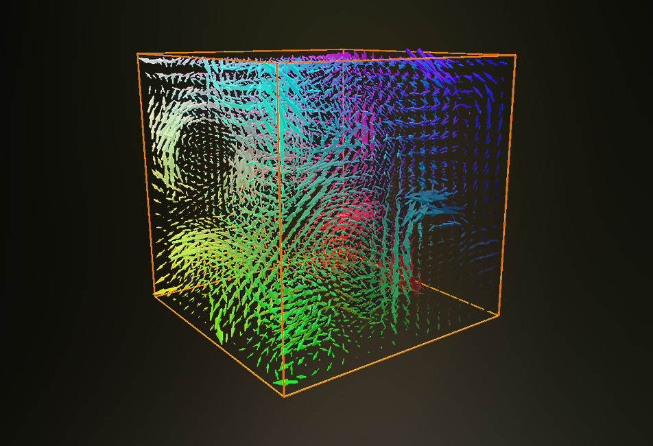 Los campos vectoriales te permiten crear un movimiento de partículas complejo para tus efectos visuales. Por lo general, se utilizan junto con las partículas por GPU. Un campo vectorial es una cuadrícula uniforme de vectores que influyen y controlan la velocidad direccional o la aceleración de una partícula. La velocidad de cada partícula está controlada por el tamaño y la dirección de cada vector, que están representados por flechas. Cuanto mayor sea el tamaño del vector, más rápido se moverán las partículas a través de él.