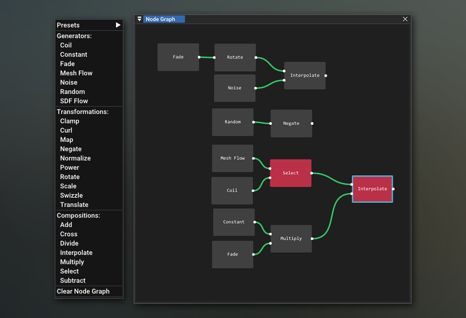 Ahora tienes un potente sistema basado en nodos para generar increíbles campos vectoriales que se adapten a tus necesidades. Utiliza estos nodos generadores para crear un campo vectorial base. Luego puedes usar modificadores para transformar, componer y controlar el campo como quieras. Si tienes un conjunto de nodos que usas con frecuencia, puedes usar el sistema preestablecido para crear gráficos de nodos reutilizables. La mejor parte es que todo está controlado y actualizado en tiempo real.