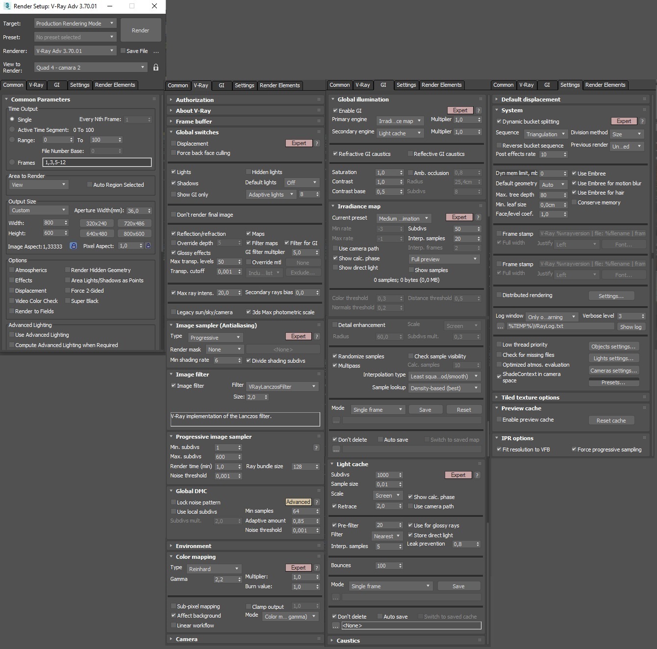 Hola. He empezado a usar la versión trial de vray 3.7, he hecho una prueba con esta escena (adjunto el render y los parámetros). Antes en la versión 1.5 era fácil controlar la resolución y el noise con el tamaño del render y la pestaña QMC sampler (solo había que subir min samples o bajar noise threshold). Actualmente en la versión 3.7 existen muchísimos más parámetros. ¿Alguien sabe como configurar correctamente esto?