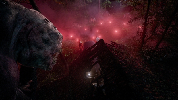 Vagando por los bosques alrededor del Lodge por la noche hay monstruosas bestias shoggoth, diseñadas y construidas por la oficina de Framestore en Londres.