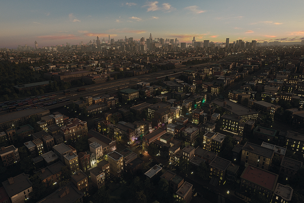 Toda la ciudad es una creación de CG, nada está pintado con técnica Matte Painting, así que tenían control total sobre la cámara y la iluminación.