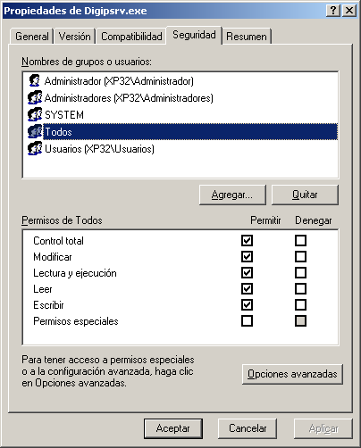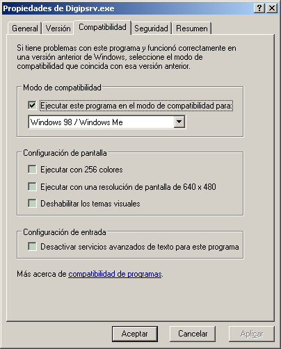 el modo de compatibilidad de ejecución del servicio de registro "Digipsrv.exe" sea Windows 98 / Windows Me (clic derecho en el archivo y pestaña Compatibilidad). Para ver la imagen más grande, hacer clic en ella.