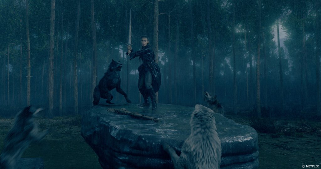 En la lucha de la protagonista con los lobos, se trata de una escena donde The Milk tubo un gran desafío, así como la escena del lobo en el episodio uno, en la que los paladines despachan cinco lobos CG para cazar a Nimue mientras lleva la espada envuelta a Merlín. Las bestias la atrapan, y durante la pelea, se sube a una roca y usa la espada para matar a las bestias una por una, decapitando a dos, una al estilo espectacular de Frank Miller. Al igual que los lobos, el ambiente en la escena es completamente CG, con la excepción de la actriz y el rock, que fueron filmados en pantalla verde.