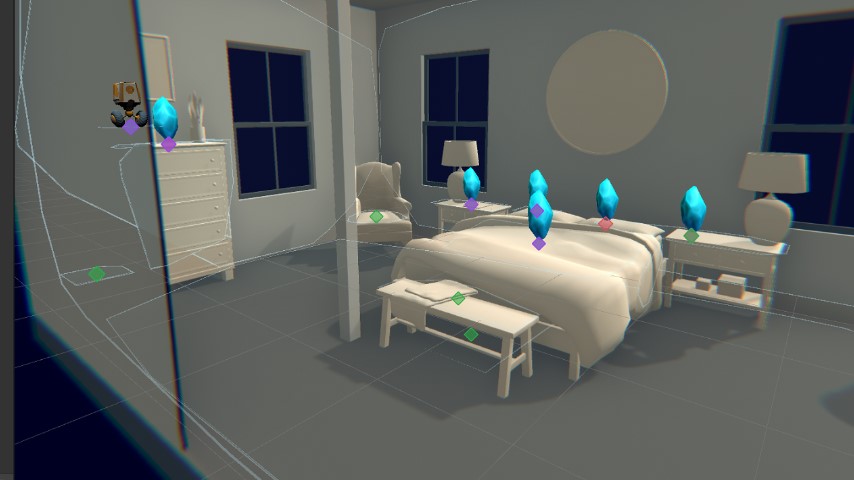 La simulación también puede crear datos para el seguimiento de movimiento, la detección de nubes de puntos y la búsqueda de planos a través de un proceso de detección de datos simulado. La detección simulada proporciona datos dinámicamente basados en el contenido del prefabricado del entorno en el mundo real real simulado y el estado de la cámara principal en la escena de contenido de Simulation el dispositivo simulado. Para emular el descubrimiento de datos en dispositivos móviles, solo detectamos datos cuando la cámara se mueve y solo utilizamos partes del entorno dentro del frustum de la cámara para añadir a nuestra comprensión simulada del mundo. También creamos planos que crecen en "chunks", como lo hacen en dispositivos móviles, pero estos planos están limitados a mirar hacia arriba, abajo, izquierda, derecha, adelante o hacia atrás.