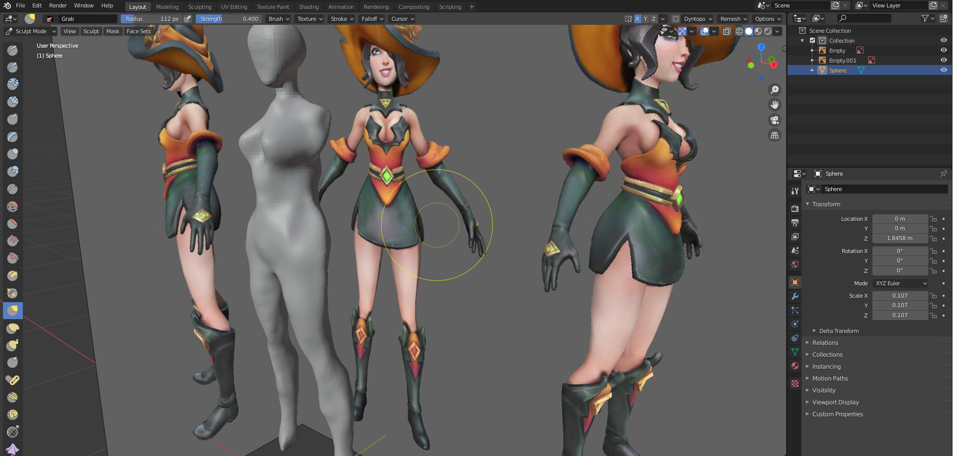 Tengo el siguiente problema, estoy esculpiendo a partir de una esfera, usando la herramienta hook (k) y la herramienta grap (g), arrastro con perspectiva del teclado numérico frontal (1) y lateral (3) y voy dándole forma al cuerpo de la brujita que quiero modelar.