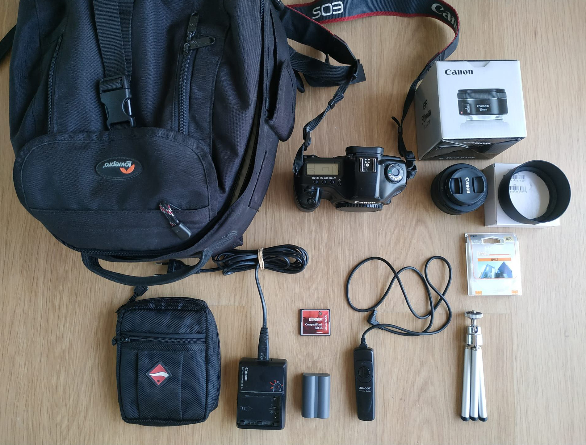 Incluyo batería, cargador, disparador, tripode pequeño, tapa, tarjeta compact flash de 32gb, mochila Lowepro, correa y miraré si tengo algo más de material en alguna caja, lo incluiré. El número de disparos, no lo sé pero algo moderado, ya que he tenido otras cámara y esta la tenía guardada.