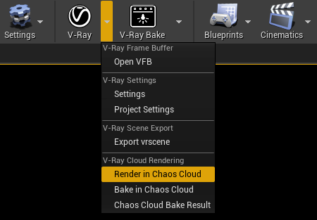 Puedes utilizar el botón render in Chaos Cloud dedicado para enviar trabajos de representación a la nube directamente desde Unreal. El botón se encuentra en el menú desplegable situado junto al botón V-Ray Render en Vray Toolbar. Menú desplegable barra de herramientas Vray > renderizar en la nube de Chaos.