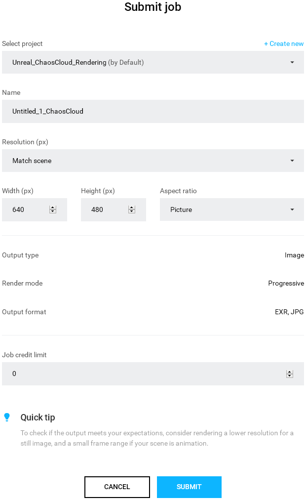 Una vez que la escena se analiza satisfactoriamente, debes concretar algunos de los ajustes del trabajo de renderización antes de que empiece a renderizarse en Chaos Cloud.